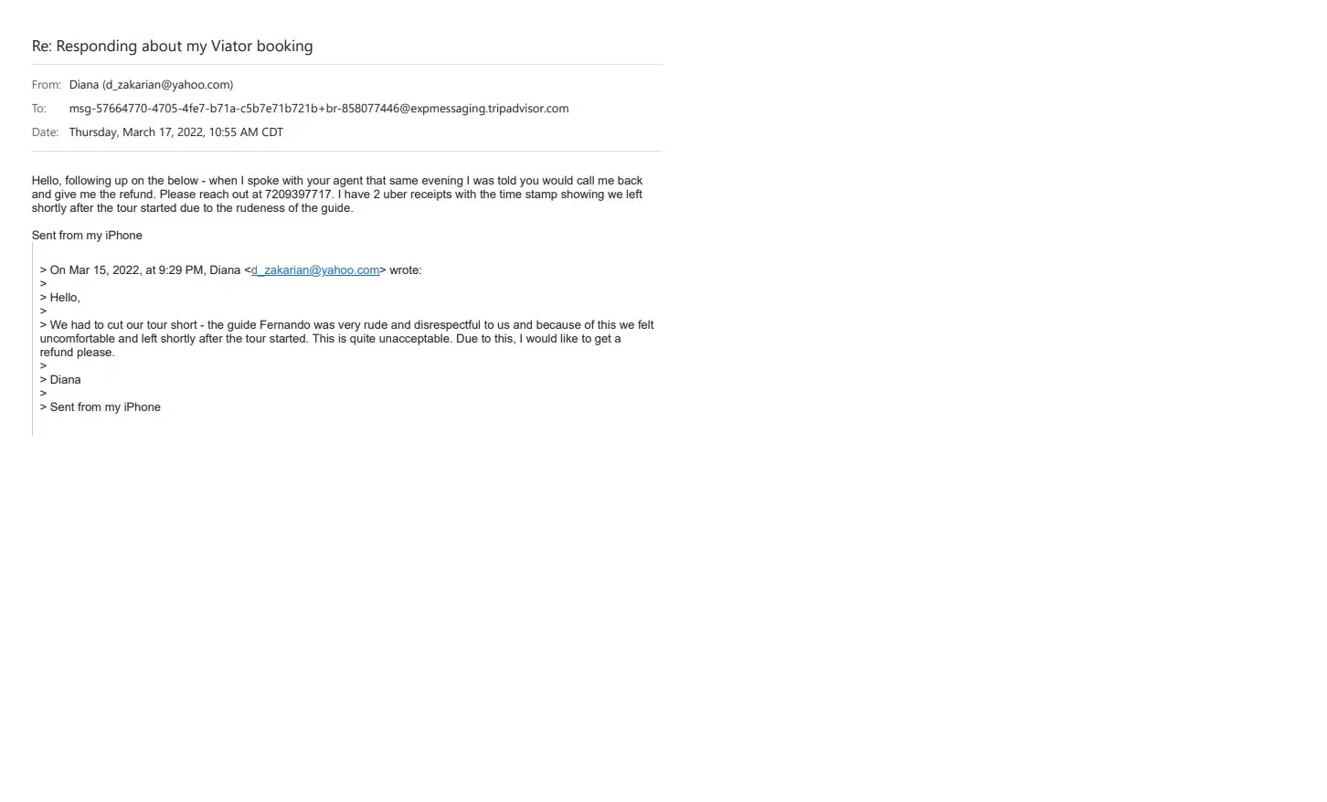 Hello, We took this tour on 3/15/2022. There were 6 people in our party. However, shortly after the tour started, we had to cut our tour short - the guide Fernando was very rude and disrespectful to us and because of this we felt uncomfortable and left shortly after the tour started. This is quite unacceptable. Due to this, I would like to get a refund...