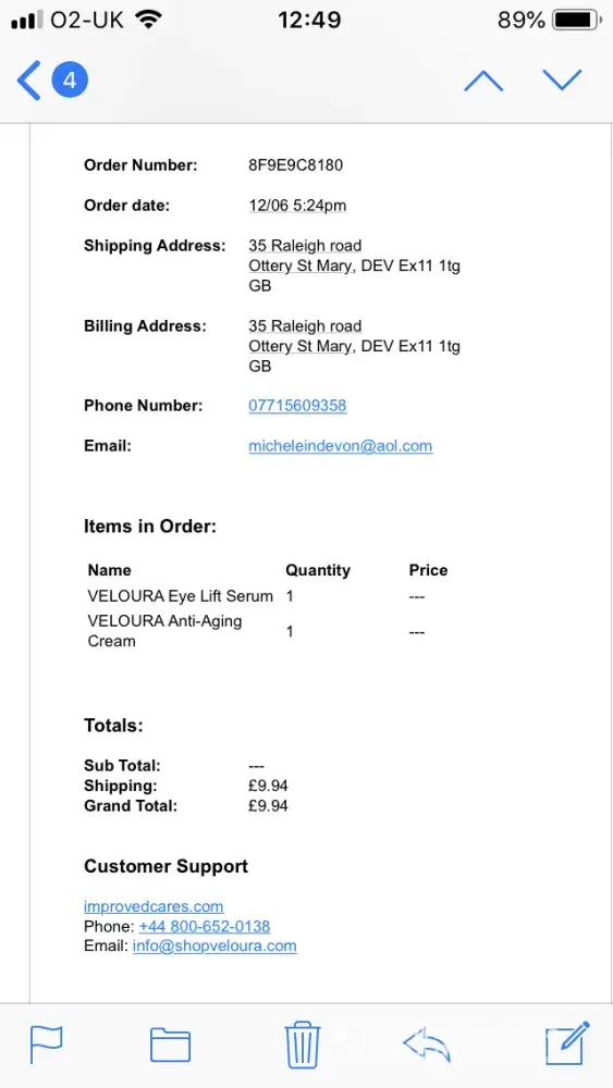 I ordered a free trial of veloura but till today I still have not got the items but was charged $199.90 on my credit card. I only agree to pay for the shipping charges not for the products. This was a total scam. I informed the bank on the dispute charges and they’re investigating.