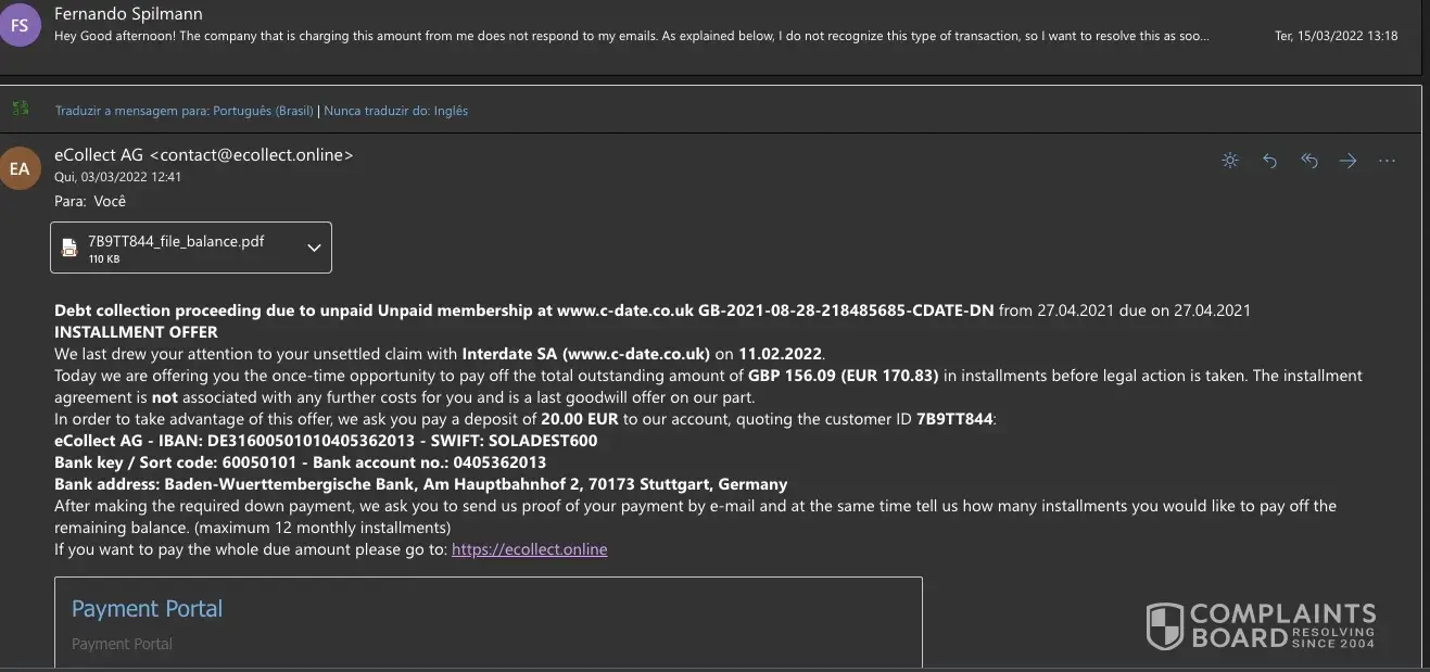 In order for us to be of an assistance to you, please do contact us directly at: cs @ c-date . com (please add ''Complaints Board'' into the subject of your message).