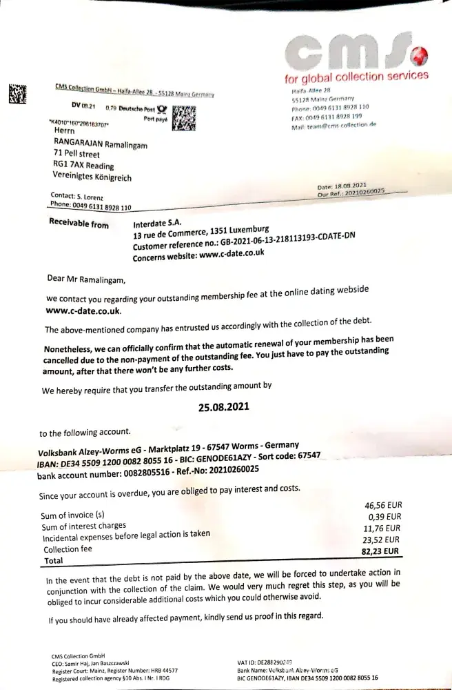 On the above note, I got to understand that there has been a premium membership created in my name and card. While I wrote a note to C-date customer service on this issue, they simply ignored my claim and now I have received a collection notice claiming 82.23 Eur while I had not availed any service.