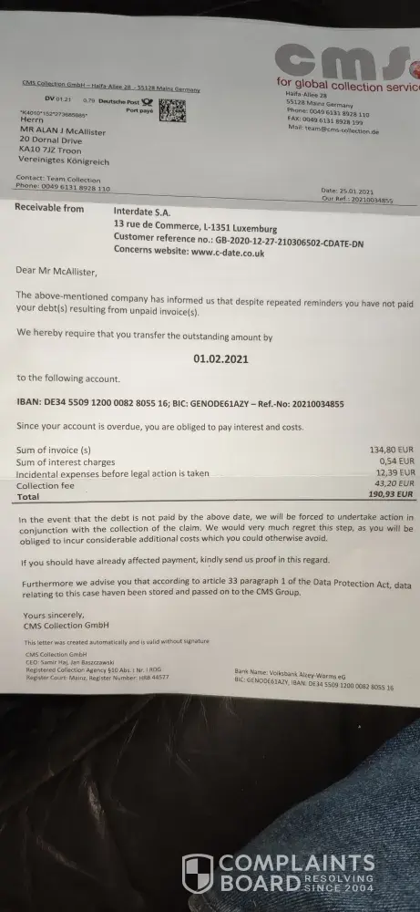 Hi! I am having the same problem! i paid for a month and wasn't aware that it would be a on going monthly thing! I have had all the exact emails you have! I spent a good amount of time requesting refunds and confirming my cancellation but they just ignored it! I heard from them almost 2 months later and that was not in respond to any of my emails that was ignored! It was a final reminder or they will pass me on to there debt collection company. It was only a month later when i found online a cancellation form which i filled out and sent to them that they started to respond to me! Saying they had already responded to my emails confirming my cancellation ( which they didn't ) and that i owe them money because i didn't cancel with in 7 days before the renewal, even though in there terms and condition it says 14 days . They also sent me a letter from CMS Global debt collection which you can tell is fake anyway, I am pretty sure that C - dating and CMS Global are they same people lol. Think about it why would they get a debt collection service on to me that are in the same country ? I am 99% sure they cant do anything to you so you will be fine! All these reviews have the same about getting letters from CMS debt collection but none of them are about any action that they have taken ? Why do you think that is ? quite simply because they do not exists. I recommend changing all your details so they cant keep annoying you! I have changed my bank details and am going to also change my emails address and phone. But do not stress to much dude, these people are crooks and nothing more and they cant do anything.