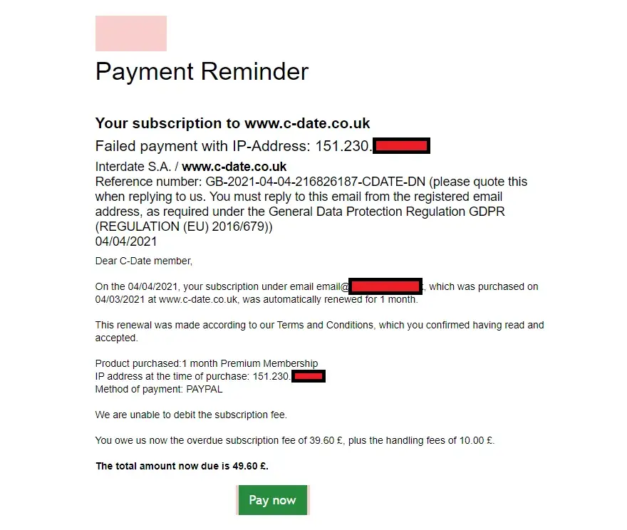 I signed up to C- Date on 11/02/2021 via the website and I was charged £9.90 for a one month membership. I cancelled my membership and subscription on the same day (11th Feb) as the website was clearly fake. I then deleted my account. I then cancelled via PayPal and via my bank.