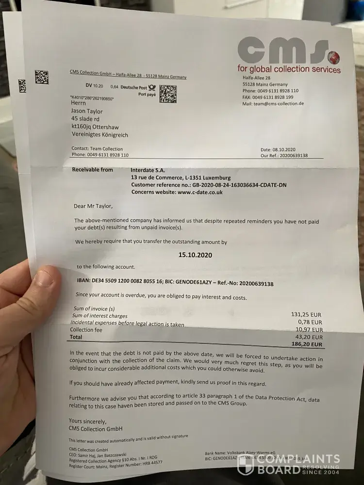 I never subscribed to C-date and know incurred debts. Received a letter today stating pay by 17/09/20 or incur more costs! There is not an English speaking person to talk too and only a fax number. How can you sort this out and I'm certainly not paying therefore you can contact CMS global management services and inform them there is NO debt to be collected. You can also delete me from your list!
