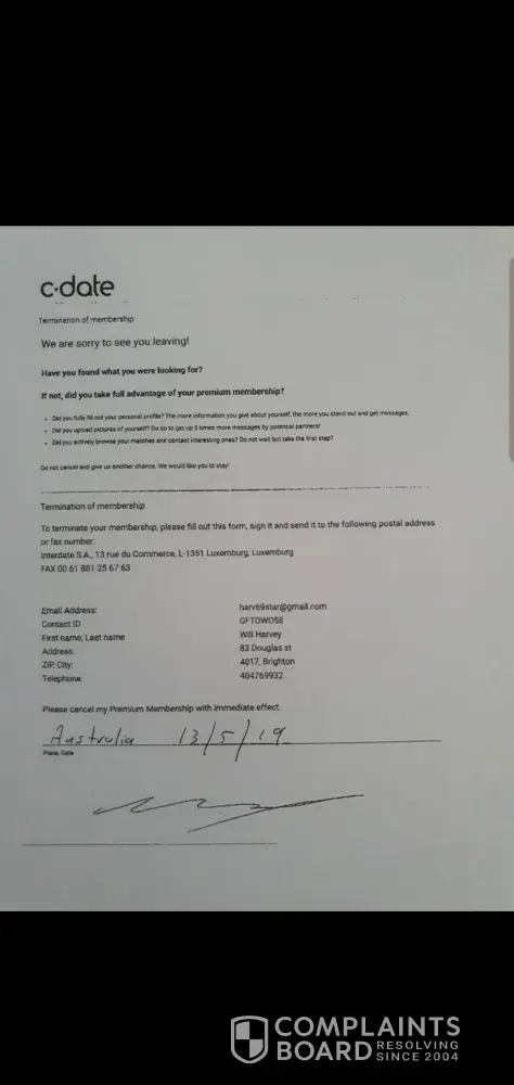 we're sorry to hear about your complaint. Please contact us directly at cs @ c-date . com from your registered email address and add ''complaintsboard.com'' into the Subject header.