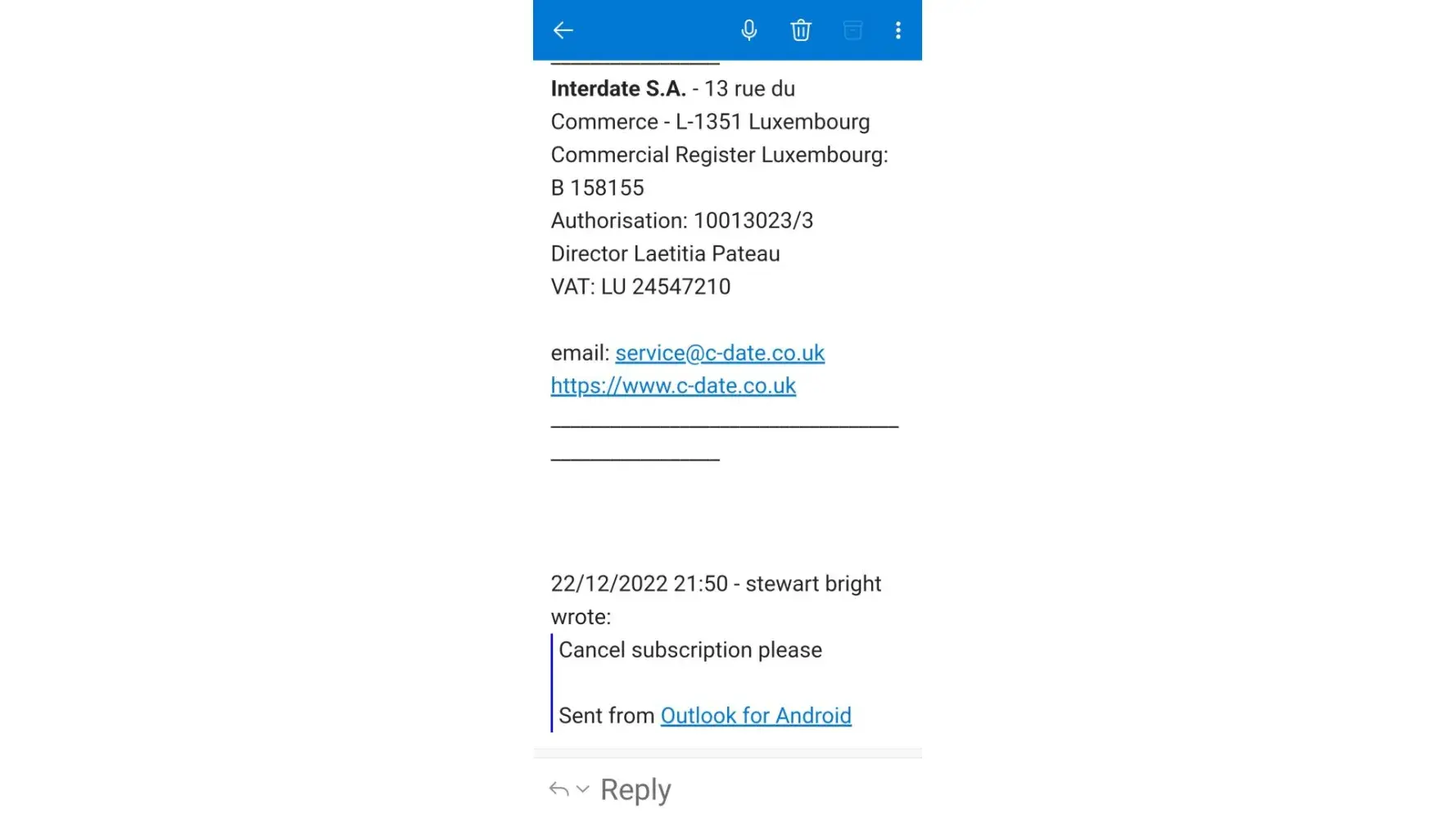 I tried cancelling the contract on line as advised by c-date but the wasn’t an option available. I then sent emails to [protected]@c-date.co.uk and [protected]@c-date.com with photos of hand written letters attached (as required by c-date) but both emails were not received. I have cancelled all PayPal payments but I am unable to confirm this with c-date.
