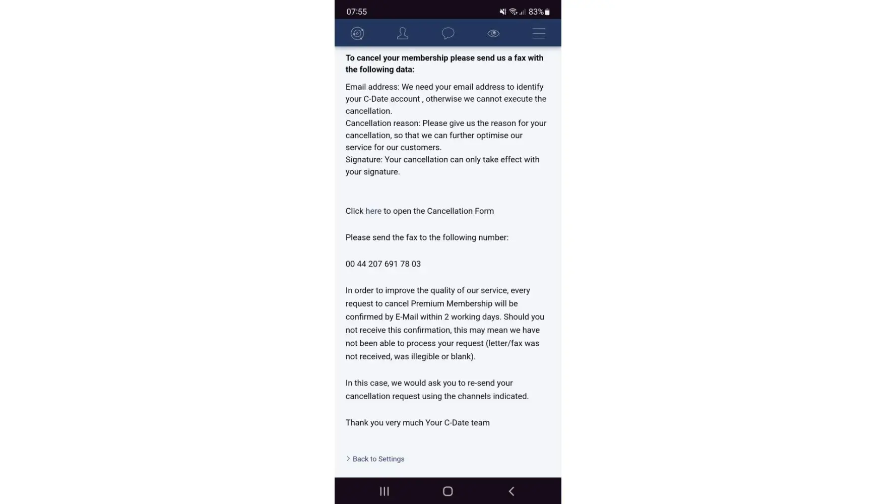 So now I am preventing from going to my Settings section due to supposed 'payment processing' period which in effect is just a way to prevent people from cancelling easily. So anyway previously I did want to cancel and the cancellation page stated I needed to send a FAX to cancel? Who in this day and age uses this method of communication. An obvious roadblock to prevent people from cancelling their membership.