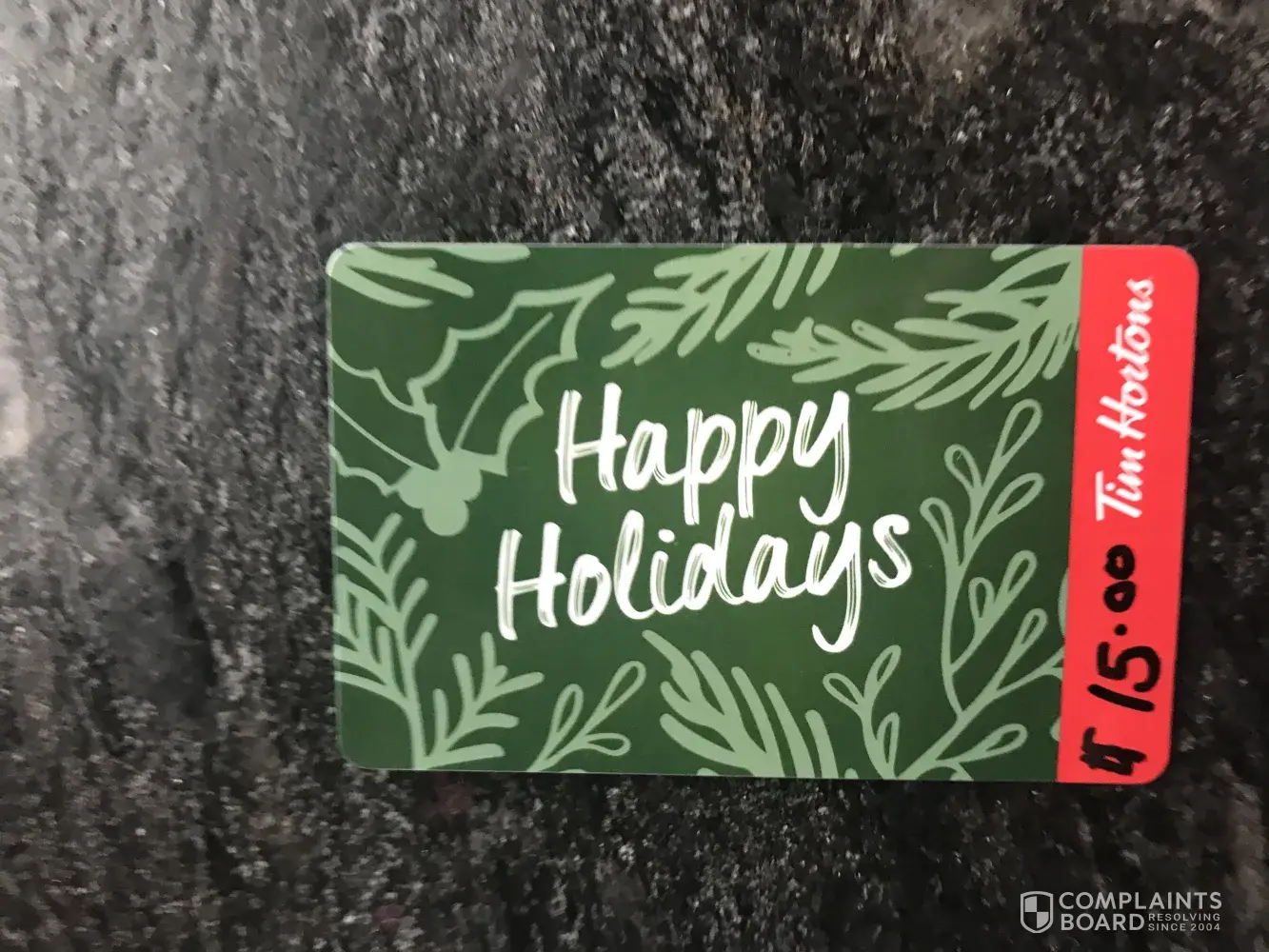 I received a $15 gift card from one of my students for Christmas. On Friday, Jan 3rd at approx 11:20am I jogged to Tim Hortons. I purchased a large soul and a large coffee. I used my $15 gift card to pay for it. I think it was approx $7.50. I actually took a picture of my lunch yesterday because I send the picture to my student who gave me the gift card to say Thank You. Today I jogged 5km again to Tim's at 4 Thomson Cres in Erin, Ontario. for lunch. I did not have my purse as I was jogging and I only had my gift card with the remaining balance. I chilli and a tea and was told that there was a zero balance on my card. Luckily the lady behind me paid for my lunch as I did not have my purse. The Tim's card number is [protected]. I scratched the silver sticker and the number underneath it is [protected]. Can you please look in to what happened to my remaining balance. I know the amount is small, but I was without money when I arrived and was depending on the card for my lunch (and energy) for my jog back home. Much appreciated. Tammy Dean [protected]