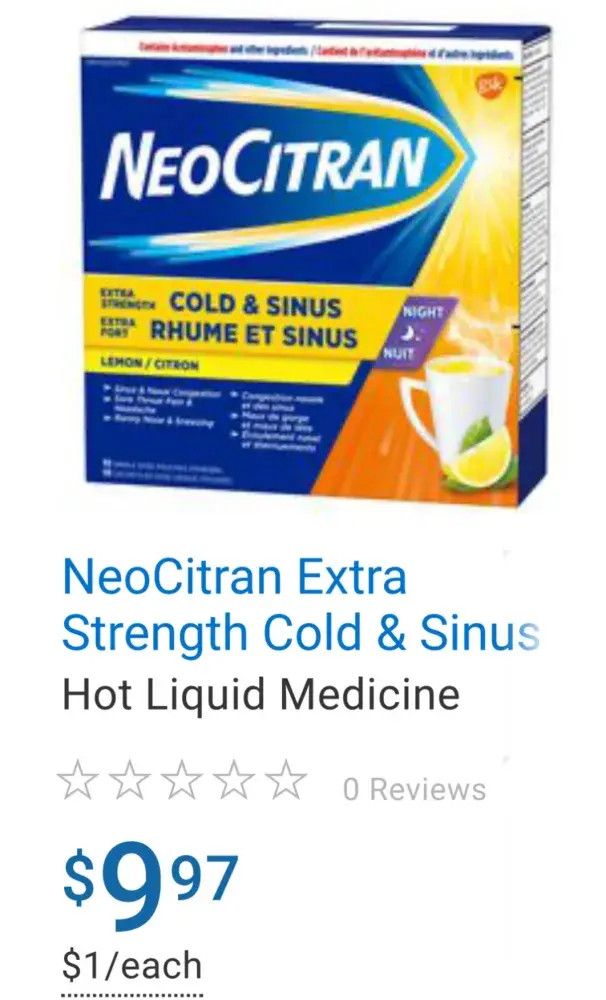 I purchased "neocitran extra strength cold & sinus night apple cinnamon" from shoppers drug mart located at the above address and I paid 14.46+ 1.88 (hst)= $ 16.37