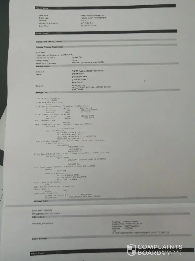 Kindly refer the attached letter regarding remittance of money, but after lapse of more then one week no money deposited in my CIBC account. You are kindly requested to confirm the transaction with Wells Fargo Bank, N.A, London Branch, London GB.