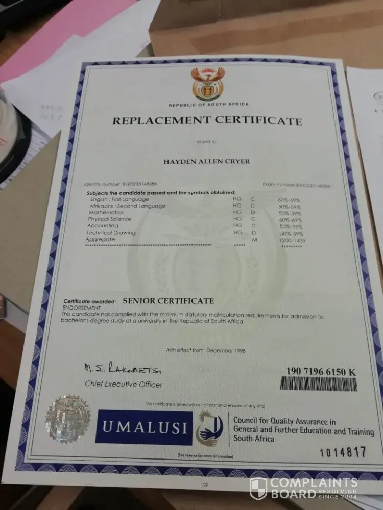 We are not getting anywhere with WES, their response is that they have not received this document and won't give us any other response. Please help us ! I can't get another certificate from Umalusi for another 6 months due to company policy so are sending is not an option.