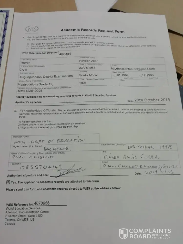I am writing to file a complaint for the WES (World Education Service). The main issue is that I wanted to make my credential evaluation for immigration propose, which is filling my application for the Express Entry program.