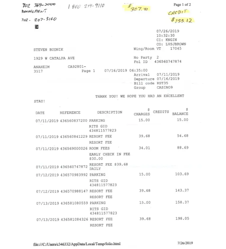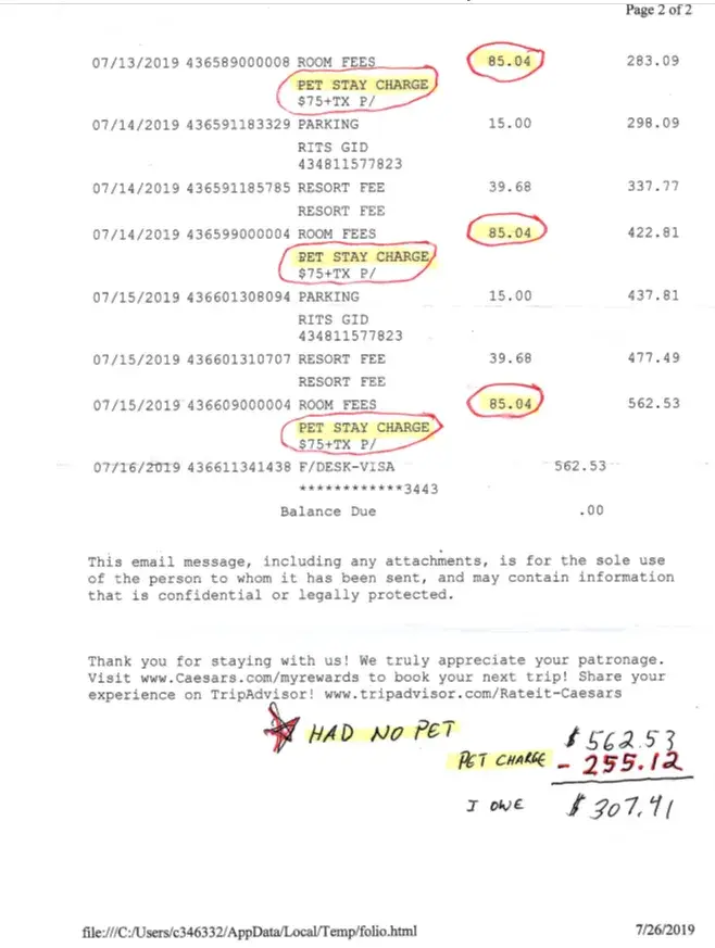 Stayed at Harrah's Casino LAS Vegas July 11-16, 2019.17th floor room 17045.Noticed the next day on my account.They billed me for 3 nights for a dog. We checked in Thurs. 07/11/2019, into Harrah's Las Vegas Hotel & Casino. Since, we had arrived early. I requested an early check in and paid the $34.01. We used their bell service checking in and checking out...