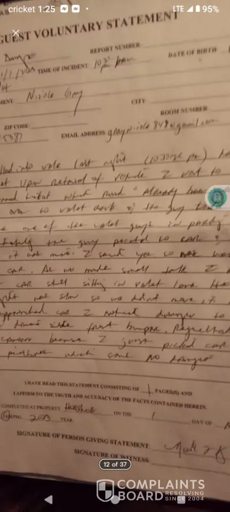 My rental car obtained front end damage while in the care of Horseshoe Hotel/Casino valet service: 10/31-11/1/2023. After immediately completing an incident form with the on duty security officer, numerous follow up calls, several attempts to contact upper management and nearly 1.5 yrs later I have yet to receive any response back.