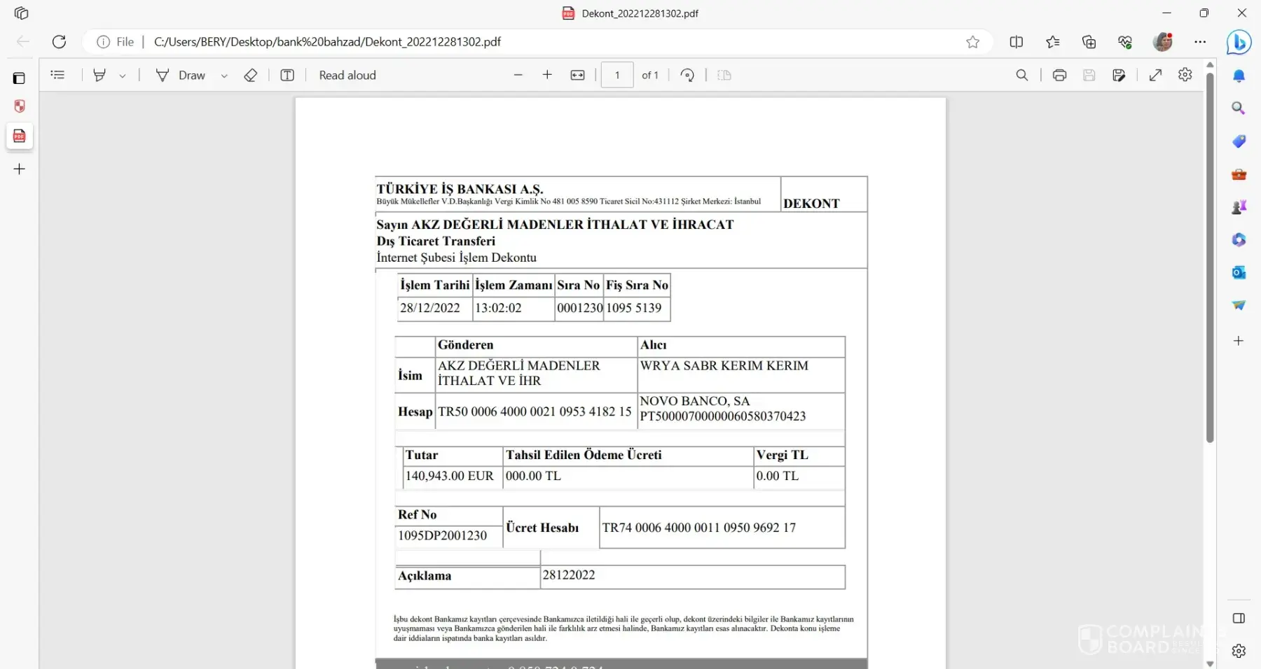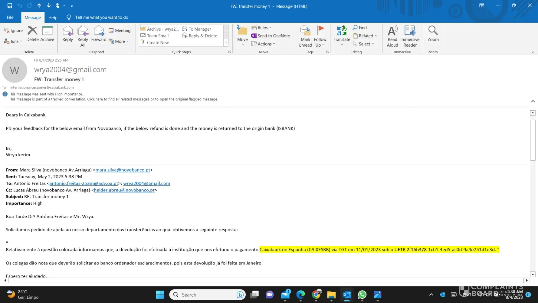 i did transaction from Turkish isbank to my account in Novobanco in portugal , and i cancelled the transaction later , accordingly Novobanco refunded the amount to the sender bank (turkish isbank) through caixabank de Espania (based on the email i have attached ) , below for the email content