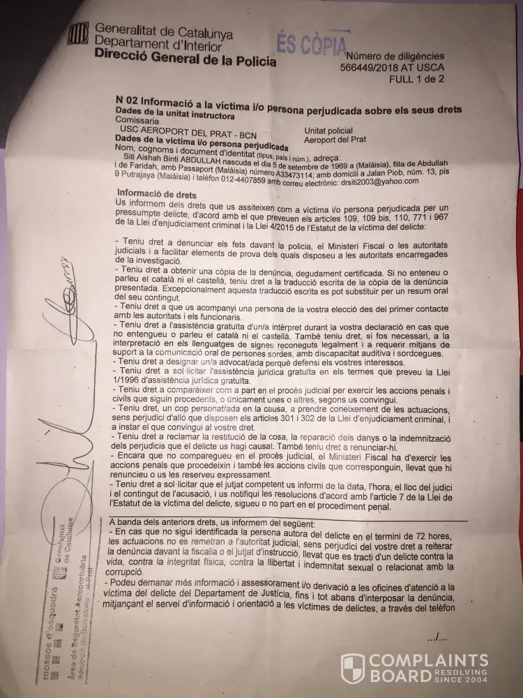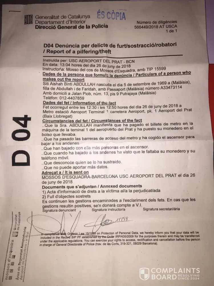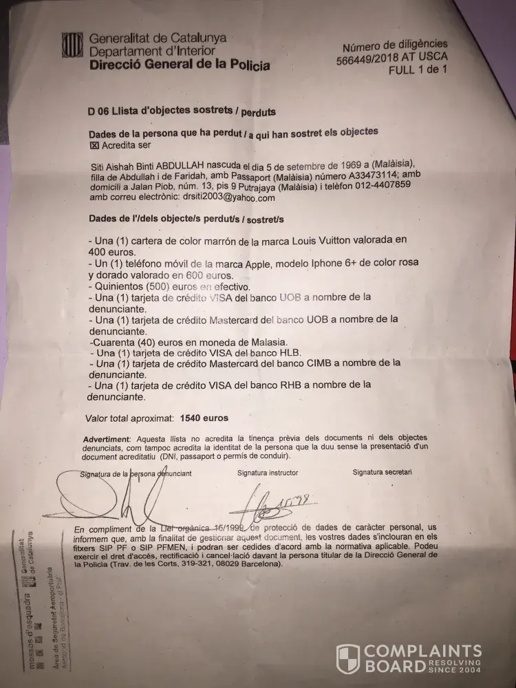 I am a Malaysian. I came to Spain for a Medical Conference. I arrived at Barcelona Airport on 26th June 2018. I was robbed at the airport and lodged a police report at the airport (police report as attached). The thief managed to do cash withdrawal amounting Euros 8, 500. There were 4 bank cards involved which are RHB, UOB, CIMB and HLB. However, only UOB Bank managed to get the amount disputed. The other 3 banks said that they did perform cash back from Caixa Bank but was unable to get the money refunded. I would like to know why is it so. Attached are some of the documents related, kindly contact me at +[protected] or email address : [protected]@yahoo.com. Thank You.