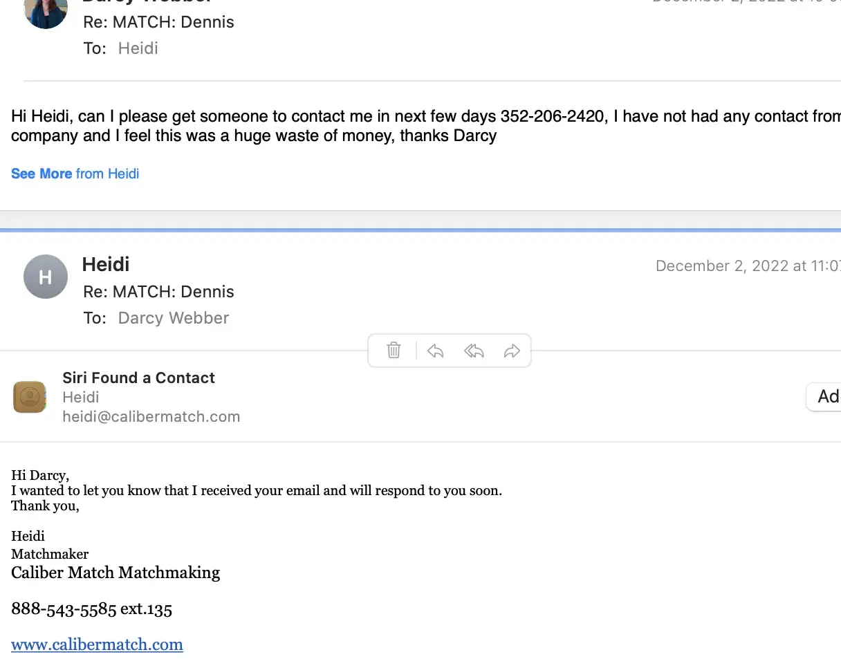 I am not here to complaint but share my positive experience about Caliber Match, in case it helps other potential customers. I am in my mid-40s and I have been struggling to meet women who are relationship minded. The online dating sites and app just don't work at my age in my opinion. I came across Caliber Match when I submitted my information through one...