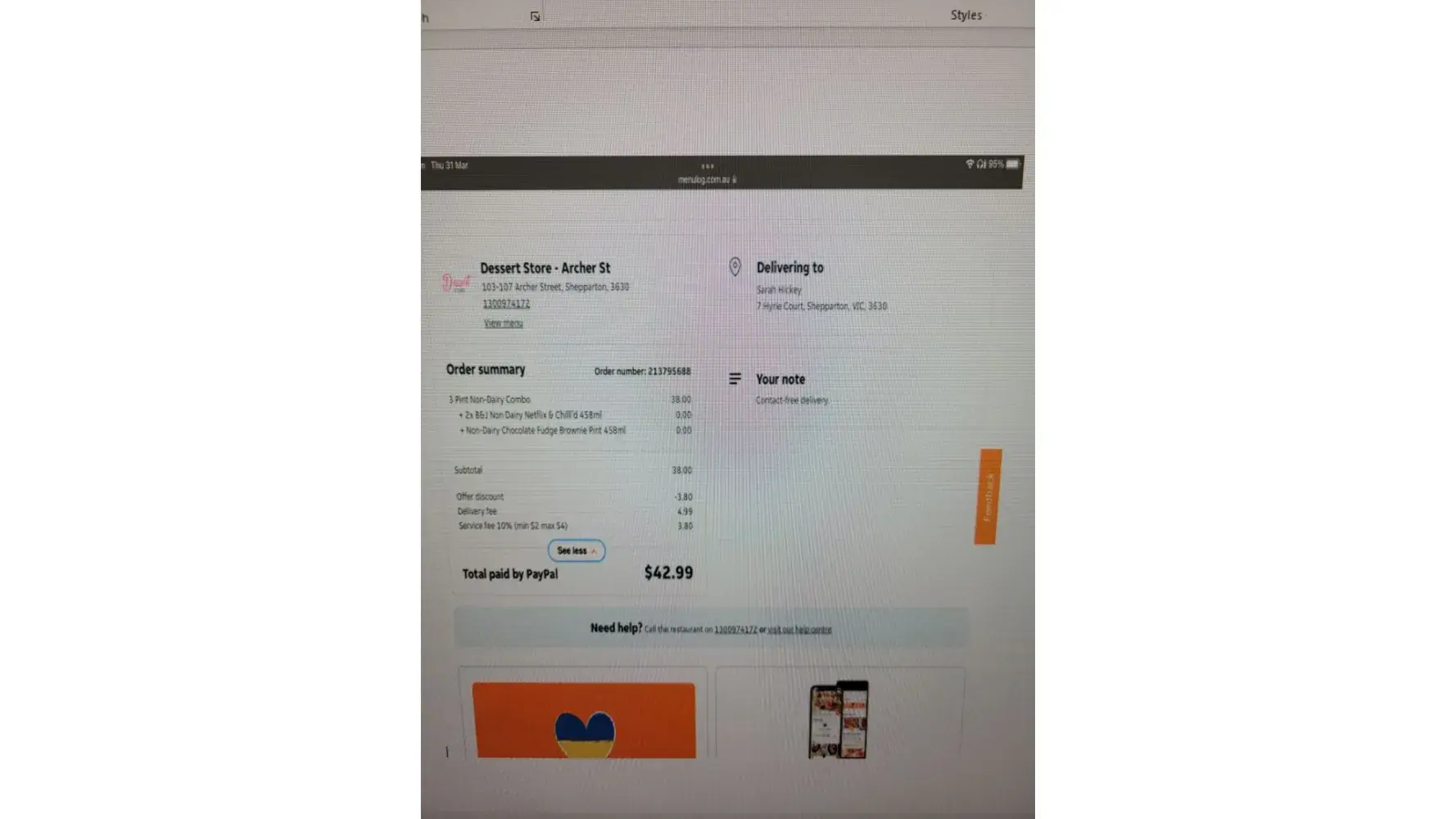 My adult autistic daughter who is suffering with covid in isolation with me, placed an order for ice-cream from the above retailer via menulog the ice cream delivered was left at the door using the correct isolation precautions.