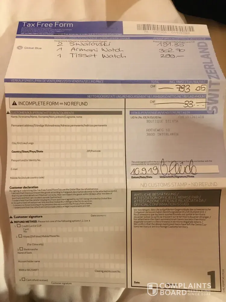 We had a very bad experience in Bucherer watch store in Lucerne, Switzerland.We were told that we will not get a tax refund if we do not have a credit card.we were told that prices for Tissot watches are same all over Switzerland But Boutique Silvia, Interlaken, Switzerland offered us 8% discount & helped us by filling out a form that can get us a tax refund even though we didn't have a credit card. This is a fraud and it is not accepted because they promised that it is the same price across Switzerland. We need immediate refund since we are still in Switzerland and will be leaving from Geneva on 13th. Also give us a voucher for 8% discount on our purchase so we can redeem it in Geneva, Switzerland.