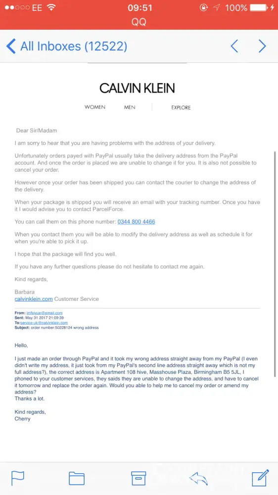 I bought three underwears from Calvin Klein online by PayPal, I even didn't wrote the address, it just took my second line of address which is not full address. Then, I phoned the customer service yesterday and emailed the customer service, the ladies on the phone saids could cancel the order, however today they emailed me not be able to cancel. It just help to correct the address to Apartment 108 hive, Masshouse Plaza, Birmingham B5 5JL. +[protected] Please help me solve this problem. Thank you