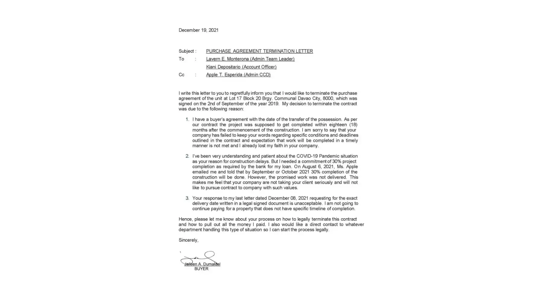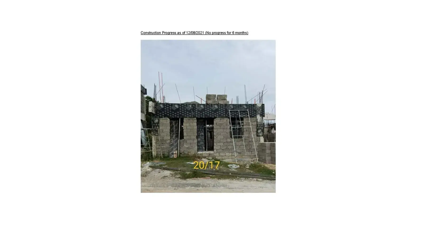 I purchased my unit on May 06, 2019 and paid P40,000 reservation fee and fully paid the required down payment by May 30, 2020 (within a year) amounting to P769,284. After that I am paying in house until 30% completion is reach as per the requirement of the bank for 1 year and 4 months. Total payments made is already P1,576,998.73. As per contract, 5 months from the start of paying the down payment construction will begin and within 18 months it should be 100% complete and with a year there will be a turnover. I am very diligent in making follow up since I am overseas (in U.S. ). In June 2021, after 2 years and one month construction is still at 15%. I am asking them to have a commitment for the 30% completion since I am also working on securing the bank loan and processing the required documents but there's no any good feedback from the "Engr Apple". They just keep on "acknowledging receipt of my email". I am losing HOPE and its giving me so much inconvenience (financially and mentally). I’ve been very understanding and patient about the COVID-19 Pandemic situation as your reason for construction delays. But I needed a commitment of 30 % project completion as required by the bank for my loan. On August 6, 2021, Ms. Apple emailed me and told that by September or October 2021 30% completion of the construction will be done. However, the promised work was not delivered. This makes me feel that your company are not taking your client seriously and will not like to pursue contract to company with such values. I am losing hope. I wanted to pull out my funds, I already sent a formal letter to terminate the agreement but I received no feedback just "acknowledgement of your email".