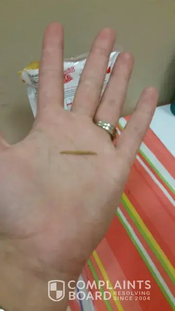 I can't believe that this was in my Campbells Gouda today! I was at work and was eating my lunch when I started choking badly, when I finally dislodged it from my throat what Appears to be a sliver of wood! I can't believe this was in there! I always drank my soup in a cup poured straight from the package and it was an upside down, recently packaged cup! It definitely came out of my soup! I am NEVER eating this again! Scared me to death! ‪#‎shameoncampbells‬ ‪#‎betterfireinspectors‬