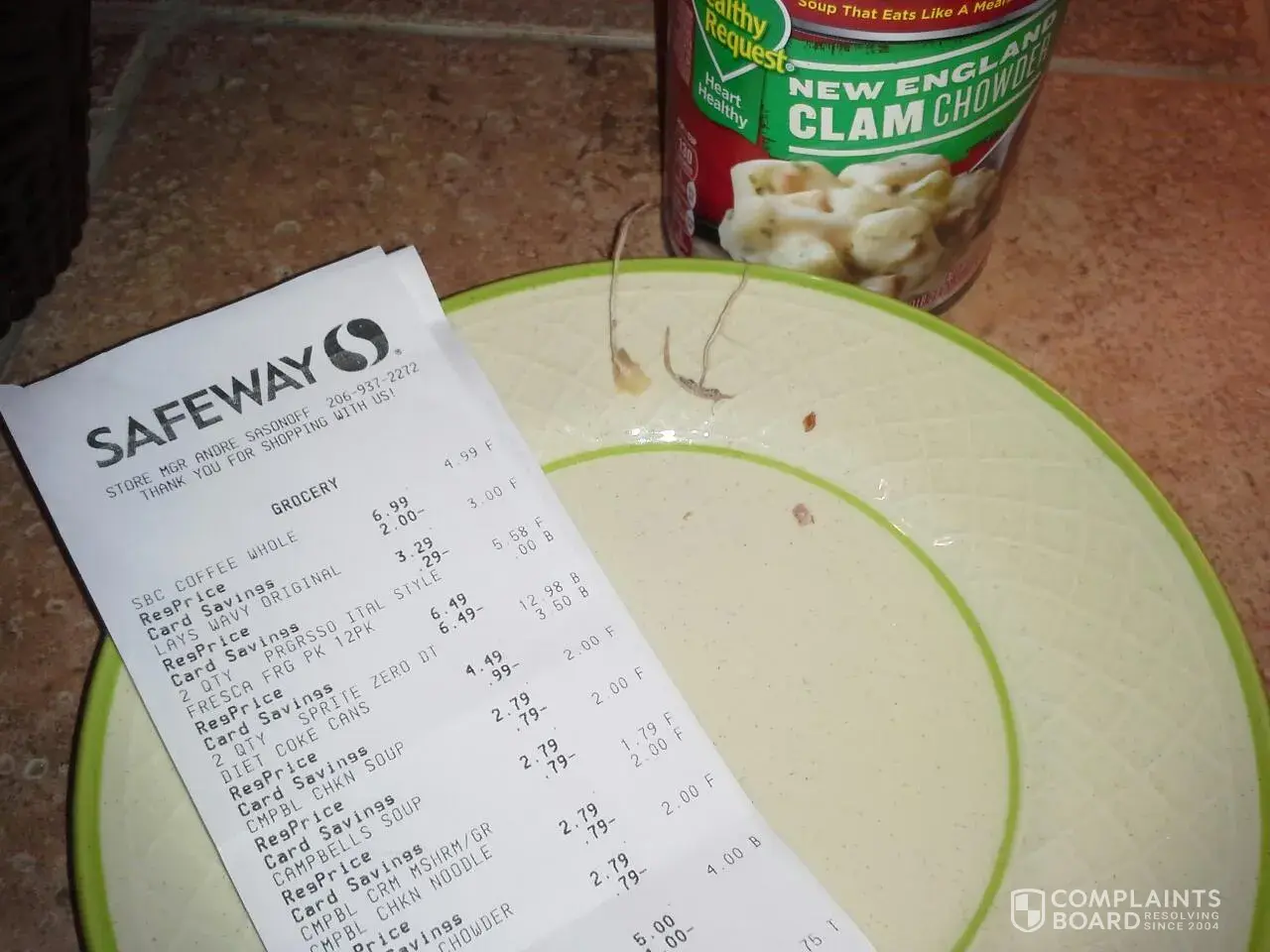 I purchased online from Walmart 2 cans of New England Clam Chowder. I opened 1 can and was disgusted with large black blemishes on the 2 of the potato chunks. I threw the chunks out but also experienced a spoon full with sand in it. I threw the can and soup out, but realized I should have taken a picture. attached is a copy of my receipt.