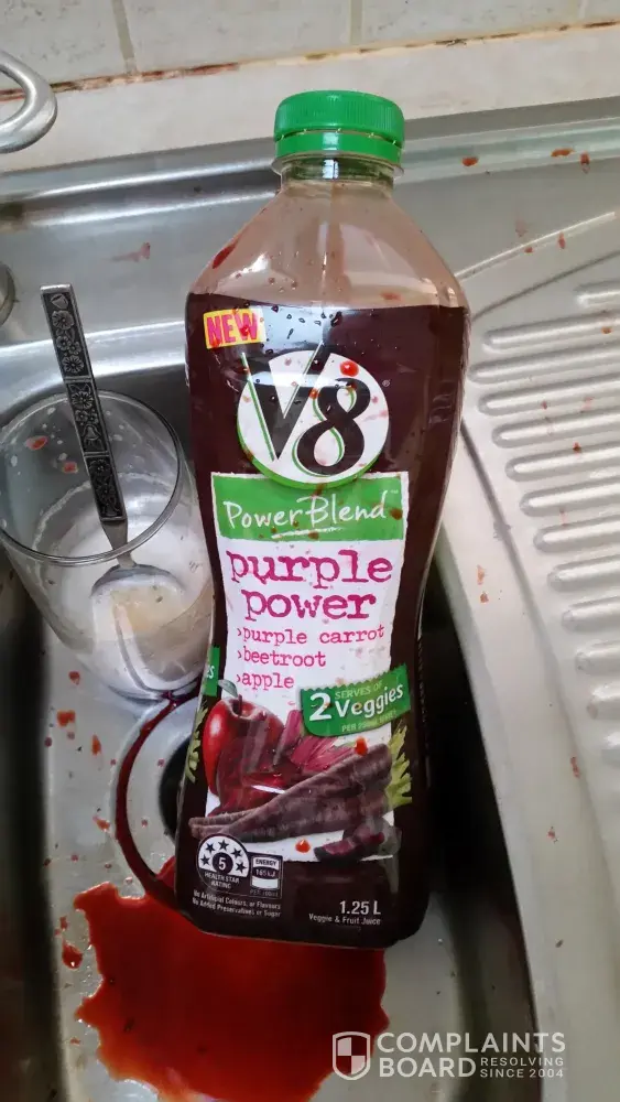 I am writing this letter in regard to a purchase of V8 Purple Power, containing: purple carrot, beetroot & apple. This was purchase by myself on 20/4/17 and I attempted to open it on 25/4/17 when it exploded resulting in purple liquid being sprayed on kitchen cupboards, bench tops, floor, walls the luiquid even went as far as the dining room where the wooden table and beige carpet were also sprayed. I draw your attention to the enclosed photos.