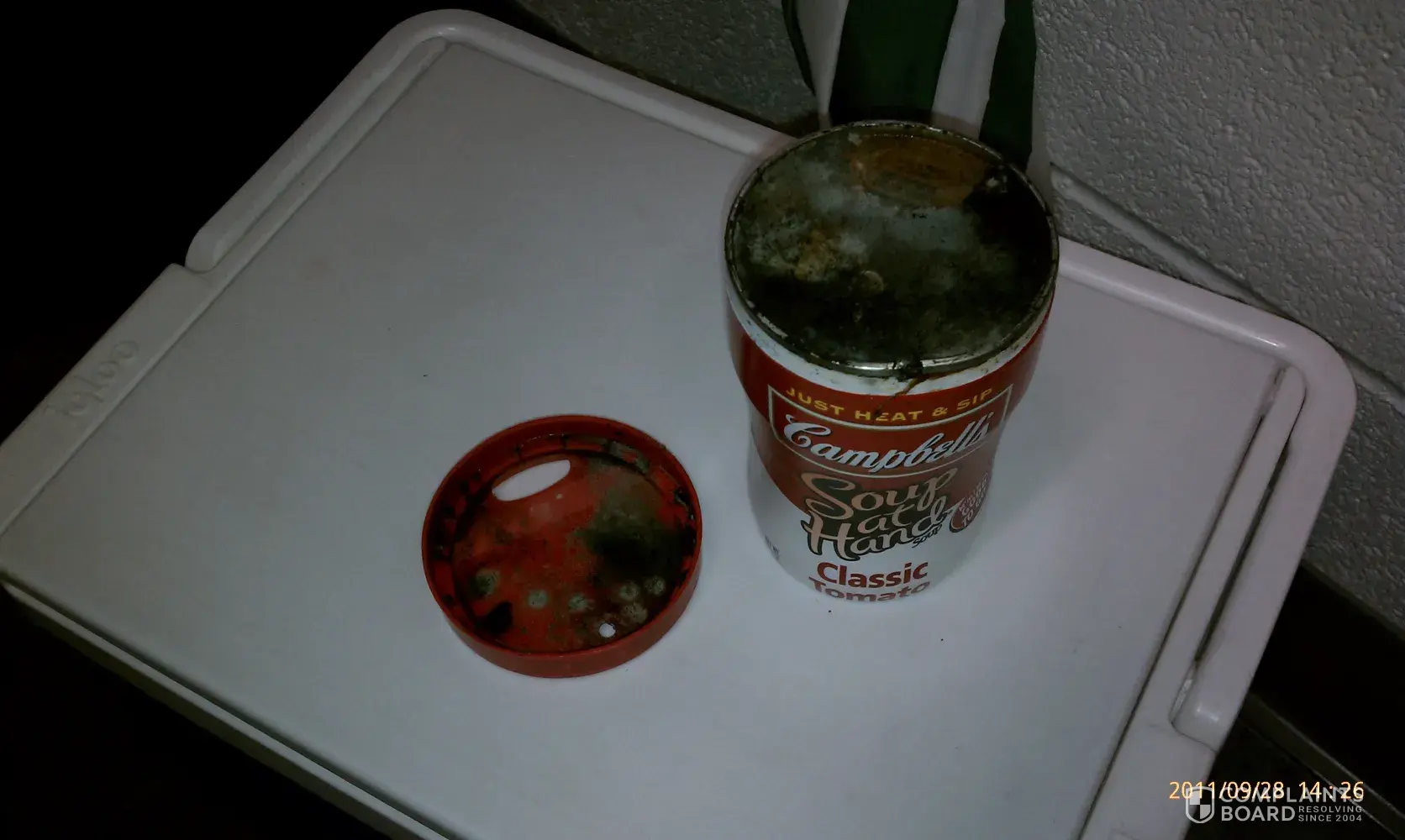 He had opened a can of Campbells Condensed Vegetable Soup to find a thick layer of mold under the lid. It was disgusting!