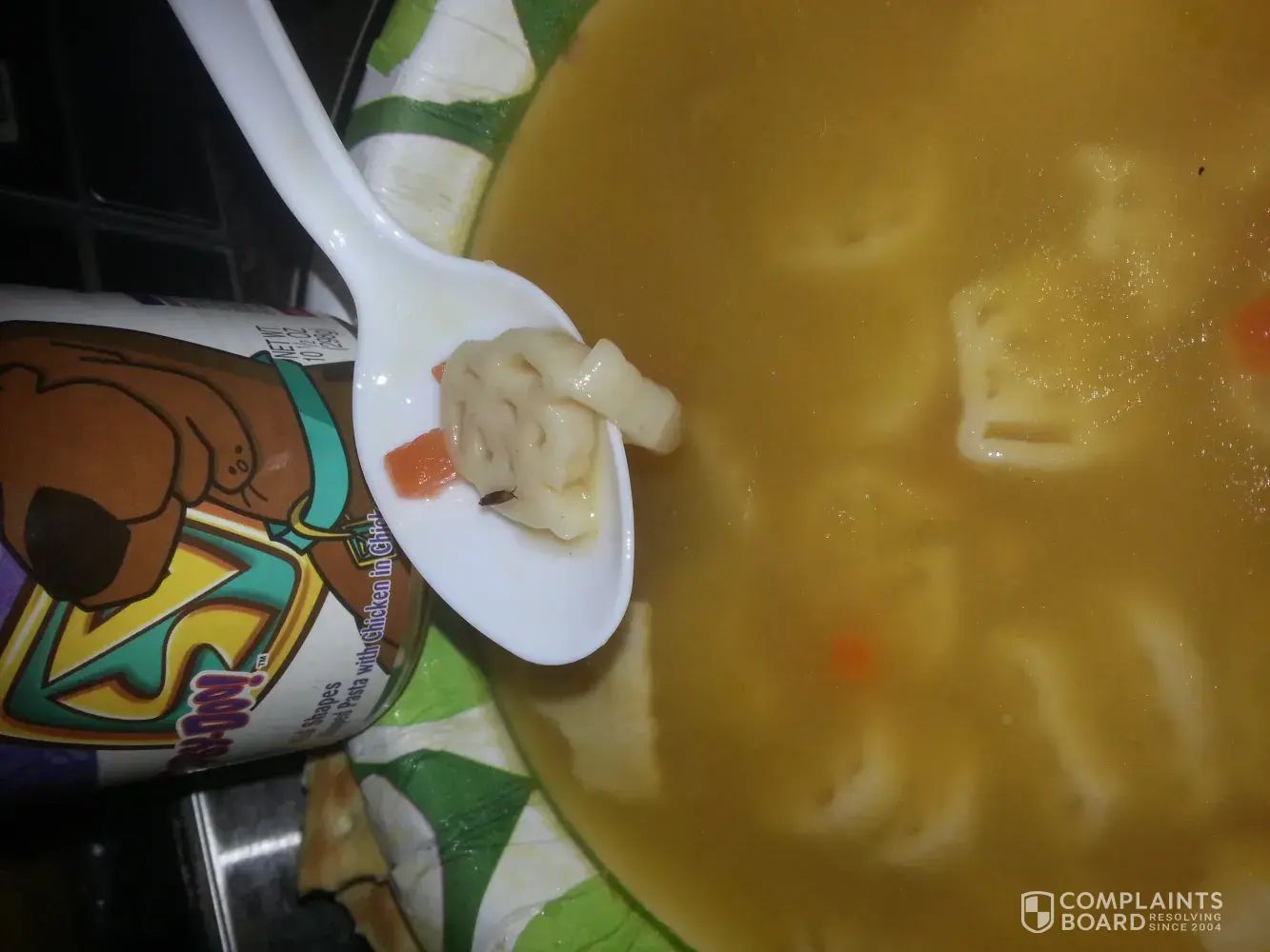 My 8 year old daughter was eating Campbell's Scooby Doo Chicken and noodle soup, when she got a strange look on her face then started gagging. I asked her what was wrong when she handed me her spoon and there was a dark brown maggot looking bug on her spoon! This is absolutely unacceptable! We all lost or appetite and my daughter vomited several times because she actually ate several bites of soup before she noticed it! We will not be eating anything out of cans anymore, especially ANYTHING FROM CAMPBELL'S! So much for soup and sandwiches for dinner. Non of us really have an appetite now anyway! See photos below!