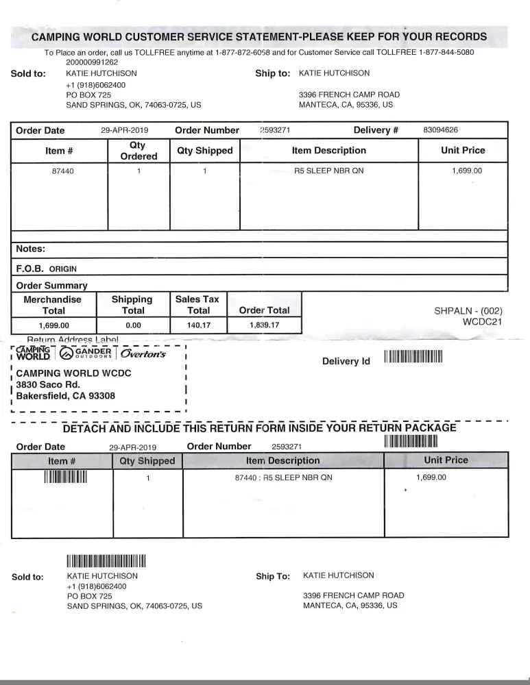 By this time it is July '19, and I have had enough of camping world. I had my insurance company reissue a check to another camper sales.