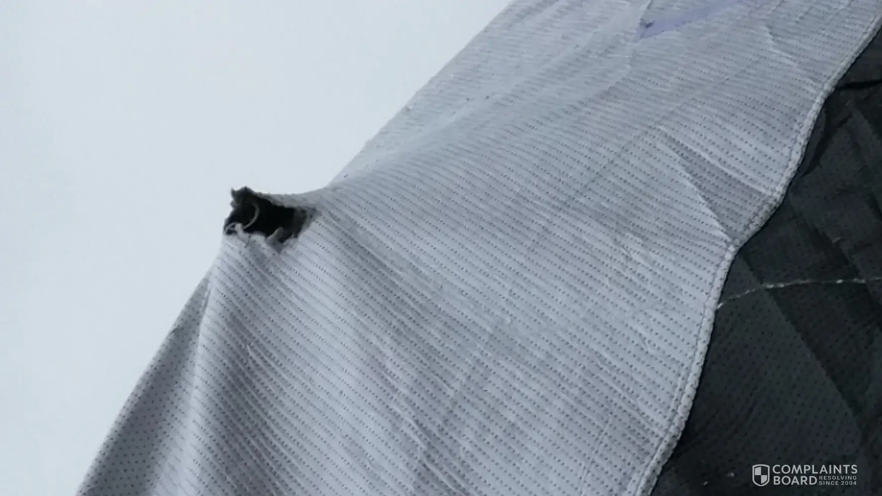 At the top of my RV is a part of the gutter system that protrudes about an 2 inches out the backside. The cover which is supposed to be strong and durable, didn't hold up at all.