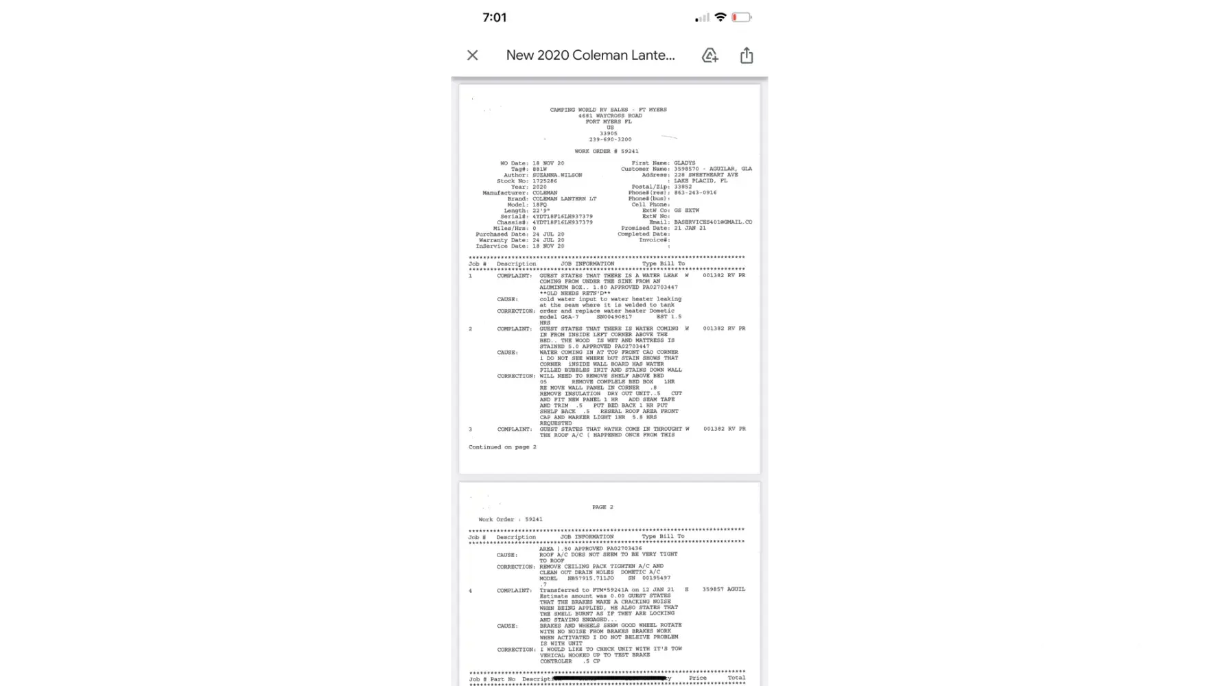 They denied selling me a brand-new RV with a bad roof. They denied fixing my RV when I first bought it. I am so glad I found the initial work order! This is what I picked up on Saturday. Shame on the company. This woman from the Camping World office says my roof has been fixed in Bartow, FL ! What is she talking about? This is how my RV was returned because of their good for nothing overpriced extended warranty. They sold me a lemon! By the way, I bought the most expensive one to make sure this would not happen! Why does is says up there extended warranty resolved! Not true.