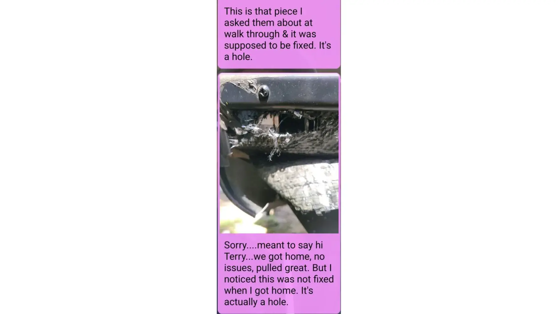 I sent him a picture of the HOLE and he kindly proceeded to tell me that after we left with the trailer he quit the job