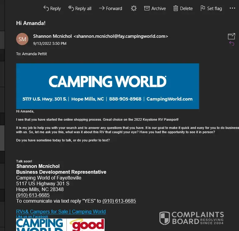 Thanks for your time reading this. I hope other customers don’t run into this same issue, as I usually have a great experience from Camping World and this isn’t the norm for me. Have bought two RVs from other locations and have dealt with a number of Camping Worlds, and this has been by far the worst experience I've encountered.