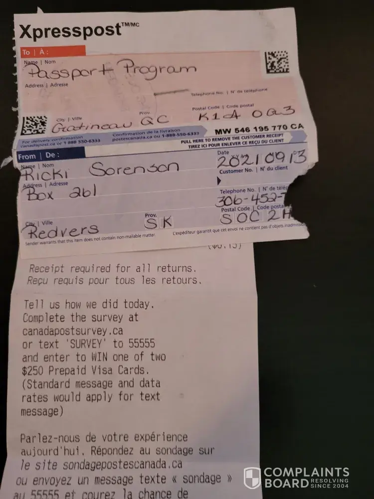 On September 13, 2021 I sent an Xpresspost item to Passport Canada through Canada Post, (Tracking # MW [protected] CA). When the envelope was mailed from the Redvers Post Office, the envelope was dry and in perfect condition. I received a call from Passport Canada that my envelope was wet and damaged. The moisture had damaged my passport application and the forms were unreadable, there-for they had to deny my application. My passport photos were also damaged in the envelope because of the moisture. I have to resubmit a new passport application and photos. I spent $23.84 to have my Xpresspost envelope delivered in a good and safe condition. I now have to spend $25.00 on new passport photos and resend my application Xpresspost, which will cost another $24.00. My email address is [protected]@hotmail. ca and my phone number is [protected] if you need to contact me.