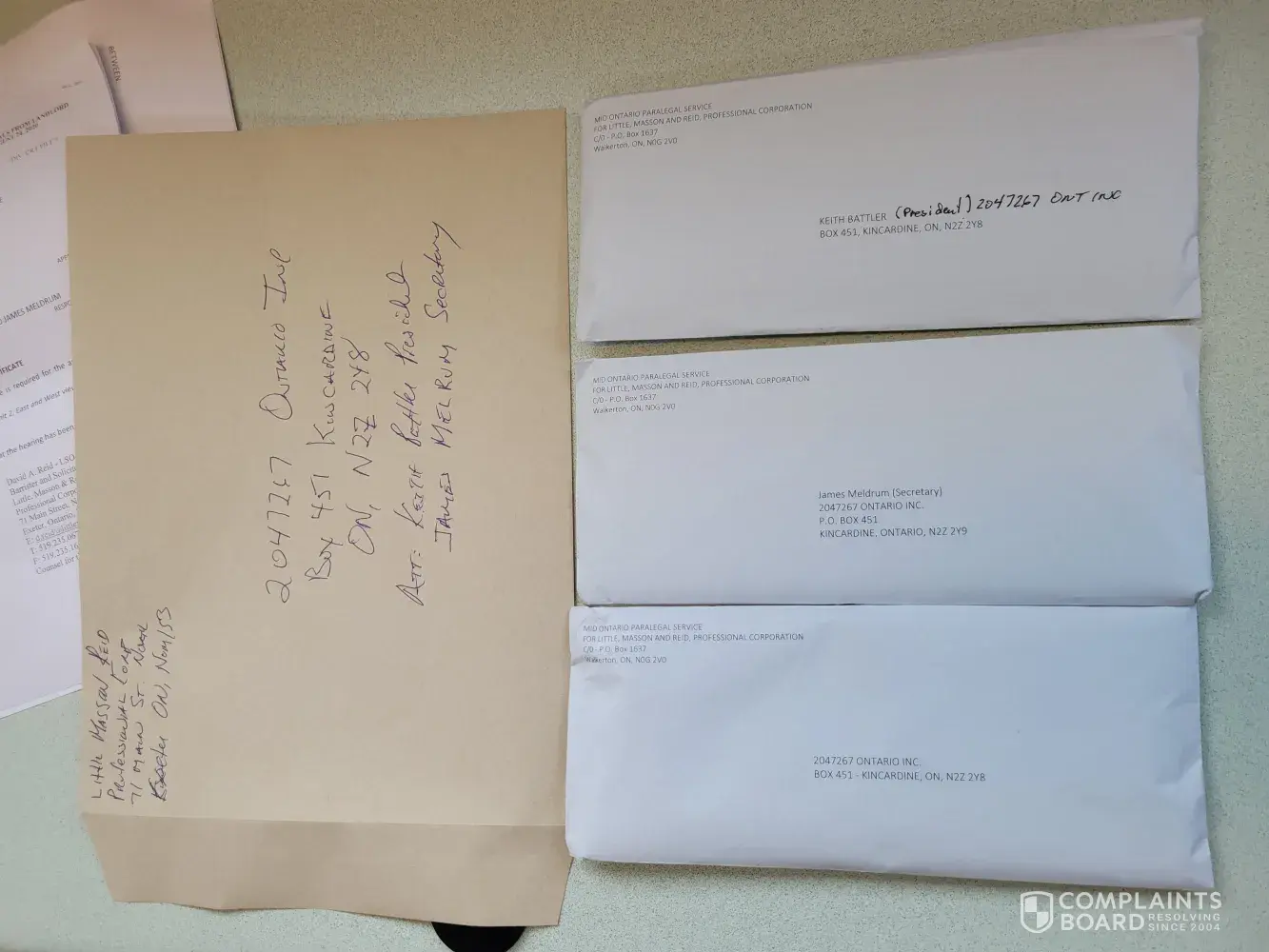 On October 20, 21 I attended a the Kincardine Post office and mailed a letter mail Letter to 2047267, James Meldrum and Keith Battler by Registered Mail - with the Tracking Number RN [protected] CA, the letter was for delivery in that post office in Box # 451 - The Box Controlled by said Individuals and found on the Corporate Registration - Filed with the Ministry of Government Services.