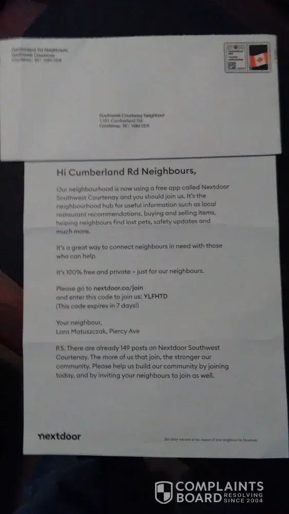 Occassionally we get mail delivered to our door from a group called https://ca.nextdoor.com/?noredirect=true . There is no way in their mailout or on their website to request them to stop sending these letters without registering and giving them my personal information. I want them to stop sending me these letters in the mail. The letter says quote "This letter was sent at the request of your neighbour by Nextdoor." I believe this is a phishing scam and I want it to stop. No "neighbour" should be able to sign me up for anything without my permission. The only information on the letter is a name: Lara Matuszczak on Piercy Ave. Photo of letter and Envelope included