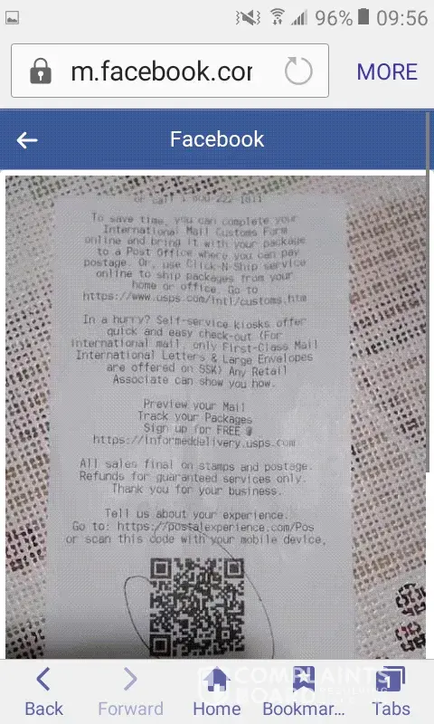 11:36 am - I receive another tracking message (with the original US tracking number) that my package is at the post office for pick up. I check the mail box and there is a delivery notice in the box.
