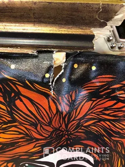 Serious damage frames & canvass tears. appears parcel was dropped onto railing approx 8" in width...from a height or pierced with a rod from a loading truck?