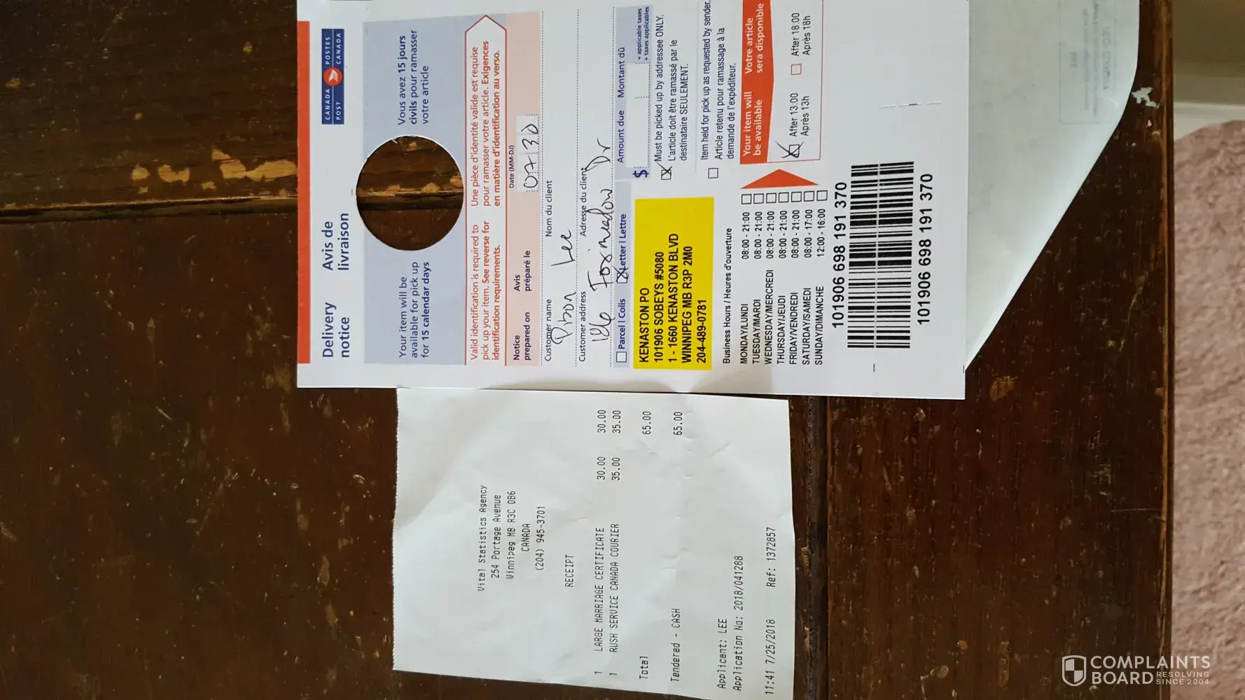 Without keeping track of my orders on line I would not know when the parcel is in as no delivery notice is being left either. We have a parcel box in our building for convenience as Fort Mcmurray is a working town with long hours; therefore, picking up parcels from the post office is a big inconvenience.