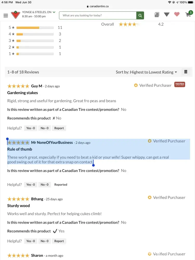 The following is a so-called customer review posted on your site on June 28, which appears under your product Select Natural Bamboo Stakes, 15-pk (18). 18 reviews #059-3037-8: