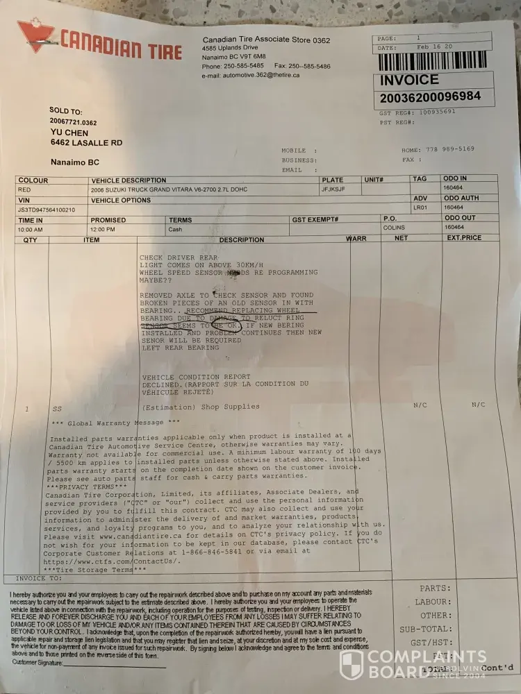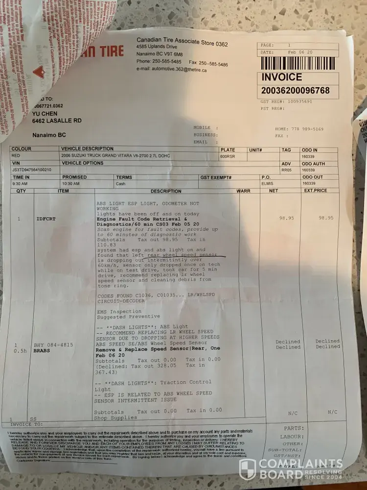 I brought my 2006 grand vitara in for service because my ABS and ESP lights were on and they run the inspection initially cost me 98 dollars, told me was the rear speed sensor, so I brought my new sensor in for them to install for me and cost me another 138 dollars, it only work for a day then stopped working, I brought the car back in and they told me it'...