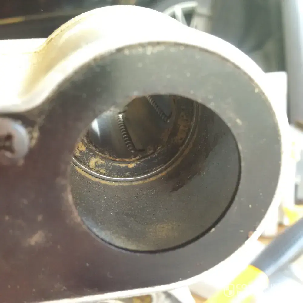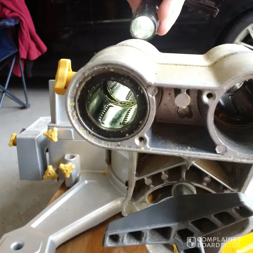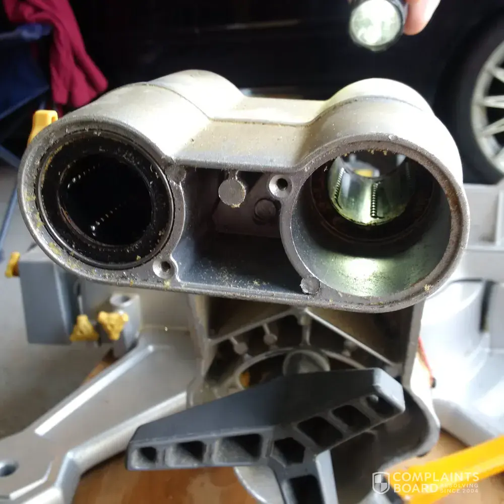 When I removed the sliders from their housing I found that one of the 4 bearing sleeves was never installed. See pictures. 055-6757-4 mastercraft 12 dual-bevel sliding mitre saw. I originally thought this was a sealed unit that can't be taken apart. But then was able to remove the bearing cover. See pictures.