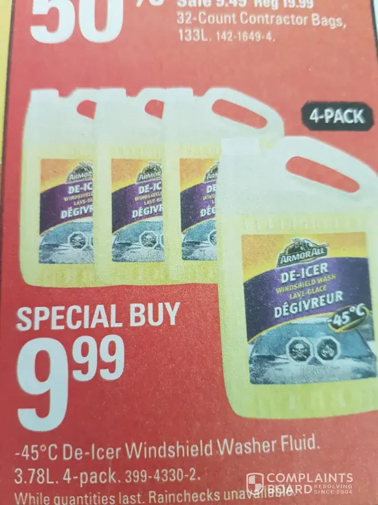 I have been a loyal customer at Canadian Tire for the best part of 40 years. My most recent complaint was a 4 pack windshield washer {9.99} that was advertised to start today December 27, 2018. The store opened at 8am and I was in the store at 8:30 am I asked the clerk where was the product was located and her response was we have none left. I want to make it perfectly clear that my issue is NOT with the clerk its the fact that 1/2 hour after the sale started there was none left. I walked around the store and besides me there were three other shoppers in the store. I also overheard another customer asking for wipers that were on sale and was told there was none left. One wonders how many items they order in when a flyer is sent out.