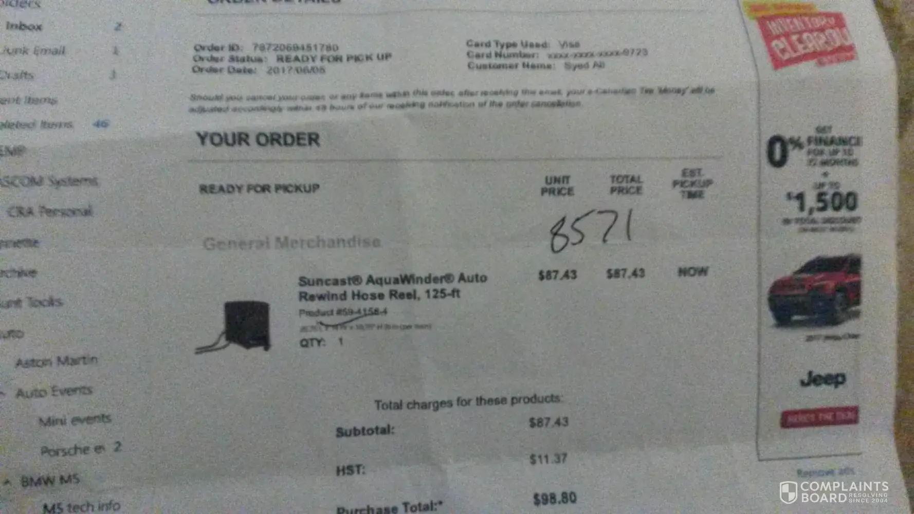 On June 5, 2017, I purchased a Suncast Aquawinder Auto Rewind Hose Reel online using Visa for $87.43 and subsequently received an email indicating the item was ready for pickup at the Canadian Tire located at 7650 Markham Road, Markham ON L3S 3K1.