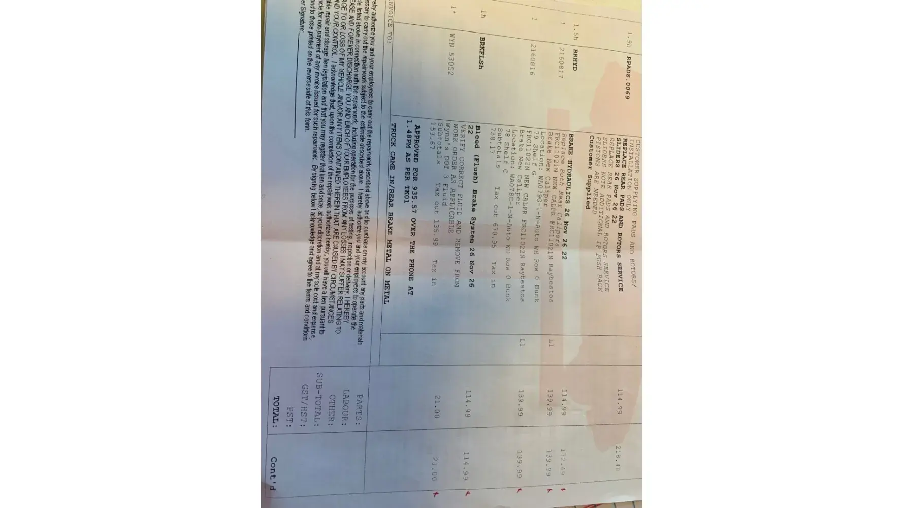 Brought in truck to get new brake pads and rotors installed ( Supplied By myself) and agreed upon with the service department to install.