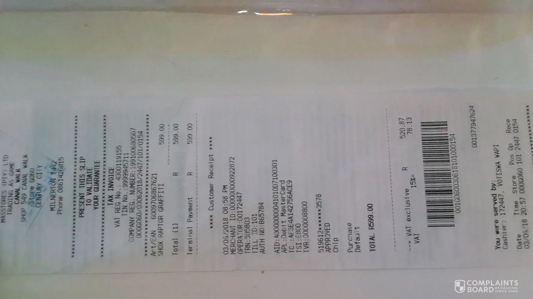 I went to Game Canal Walk, spent R600 on a SHOX Quadcopter. That was just before closing time. The quadcopter was the last one on the shelf and also had the extra security tag on wrapped around the box. One expects that when you purchasing items from Game and its in a box and has the security tag on it, that is is brand new and unused. When my son opened it, only the quadcopter and remote was in the box. You could see that the quadcopter was used and fallen before. The following items were also missing from the box: