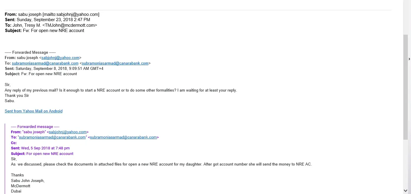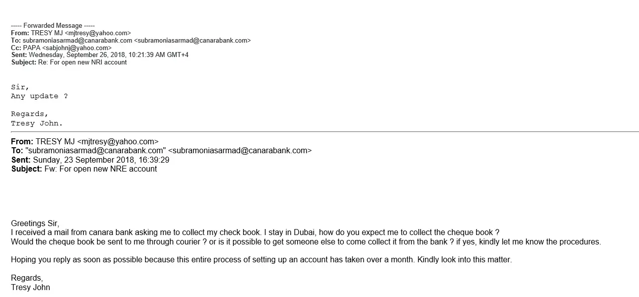 Since September 5th we have been forwarding proceedings to start an NRI Account. we have been email a one Mr. Subramonia with the following email address : [protected]@canarabank.com.