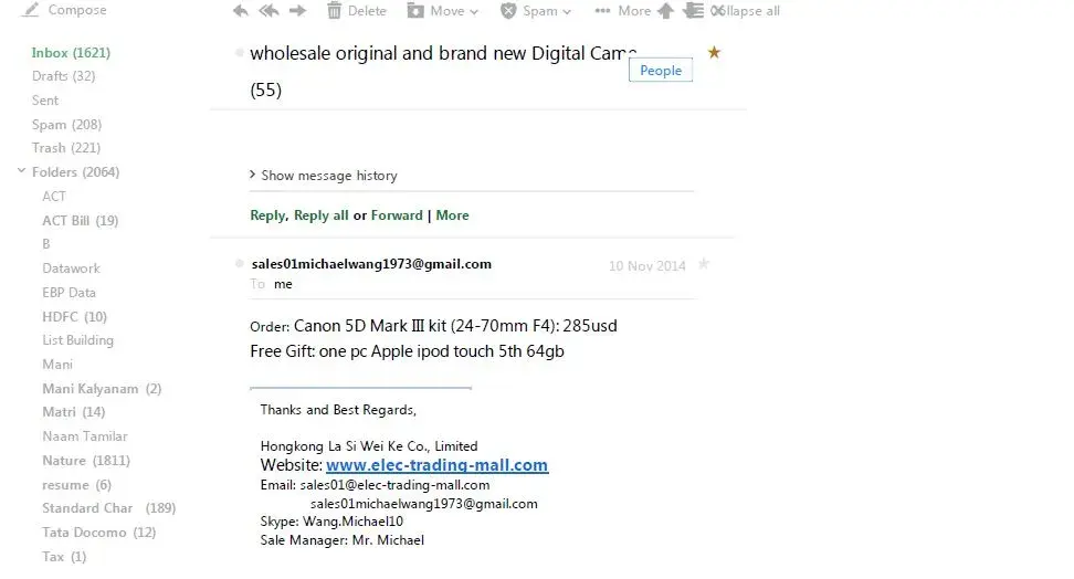 I have purchased Canon 5D Mark III with lenses on 15th November from below mentioned person mentioned below. They sent me parcel with 10 kingston 64GB pen drive. Please let me know how to move forward to get refund what I paid or get what I ordered.