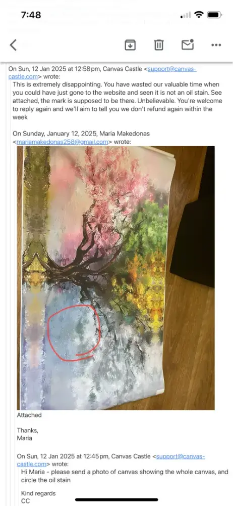Canvas castle is scamming their customers, selling low quality artworks and then running off with the money. When I received my canvas it was really poor quality and there was an oil stain on it, so I asked for a refund. They said no returns and offered me another [censored] quality product.